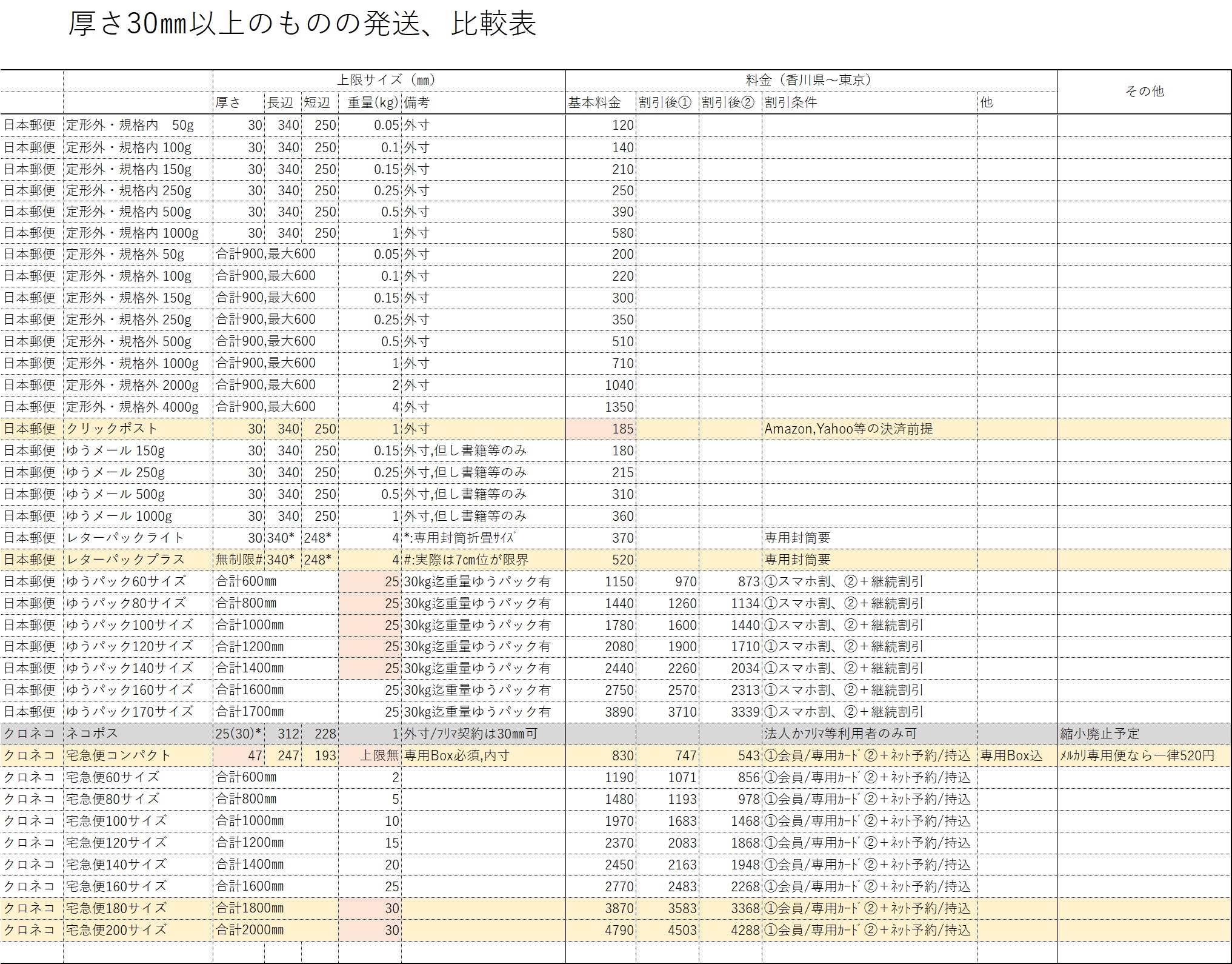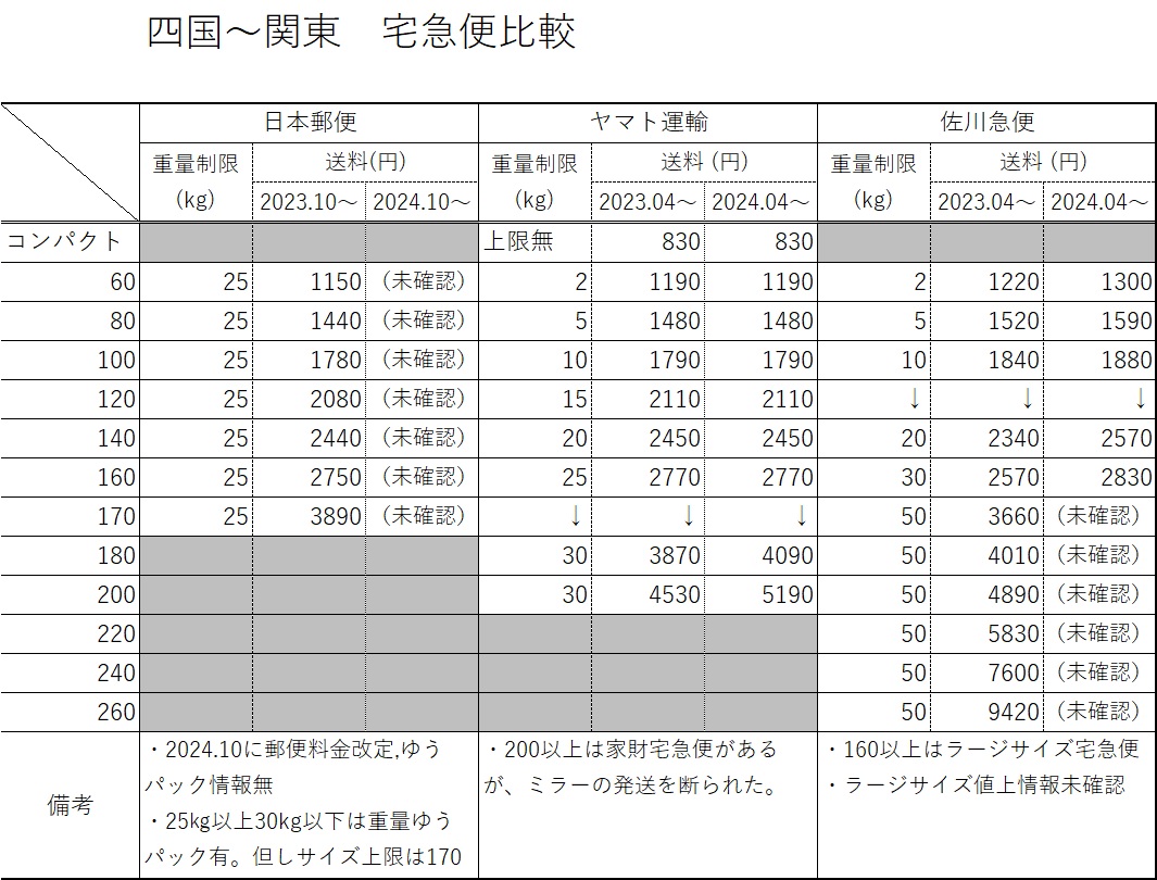 すいません。先の表の宅急便のところ、少し不正確だったのに気がつきました。