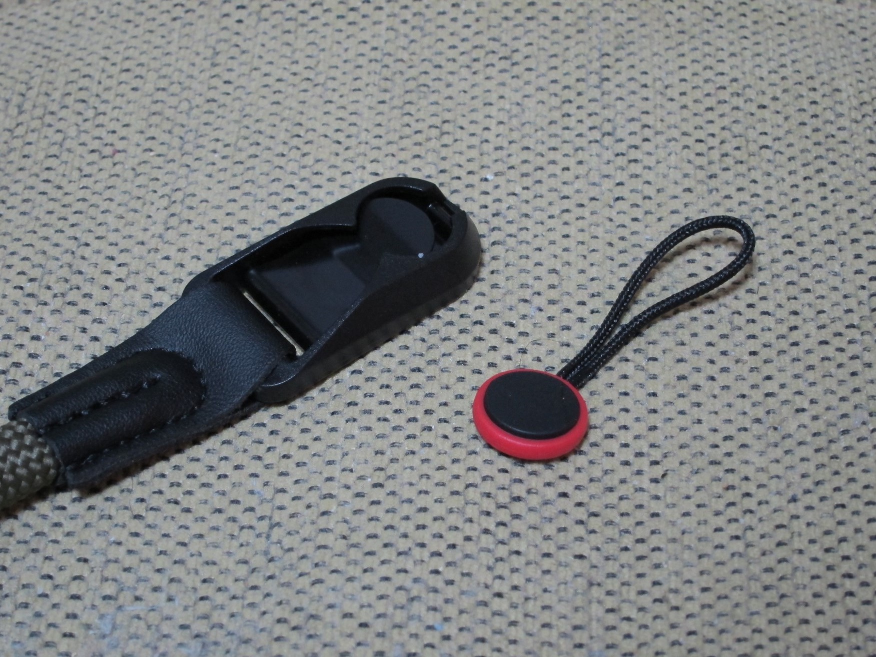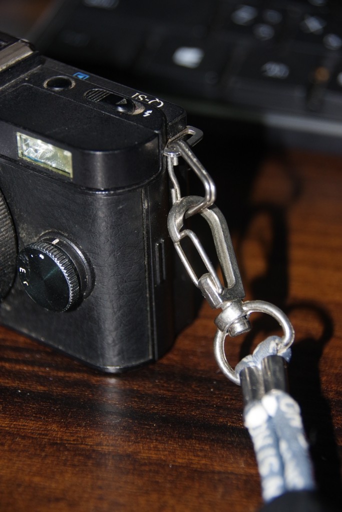 三角リングが残るのが不満ですが、ハンドストラップやショルダーバック用のベルトとか、ナスカン付のものは多いので、いろんなものが、多対多で共用できます。
