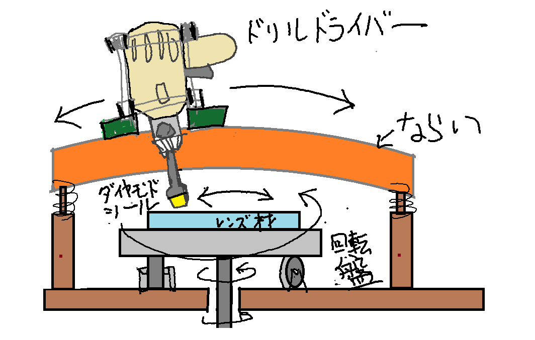 2人とも若かったし,アイデァも豊富に湧いたし,ディスカッションは土日のどちらか1日だけ!,と決めていましたが朝から晩まで話し合いました.しかし,共ずりが全てといっても,合計8面を艶出しまで磨かないとならないし,計算すると随分曲率が深いし,特に凸面は凹面の3倍くらいガラスを削ります.2人がかりとは言え,研磨機を作らないとゴールまで辿り着かないだろうと言うことで,光学系が決まると次に研磨機を考え始めました.
