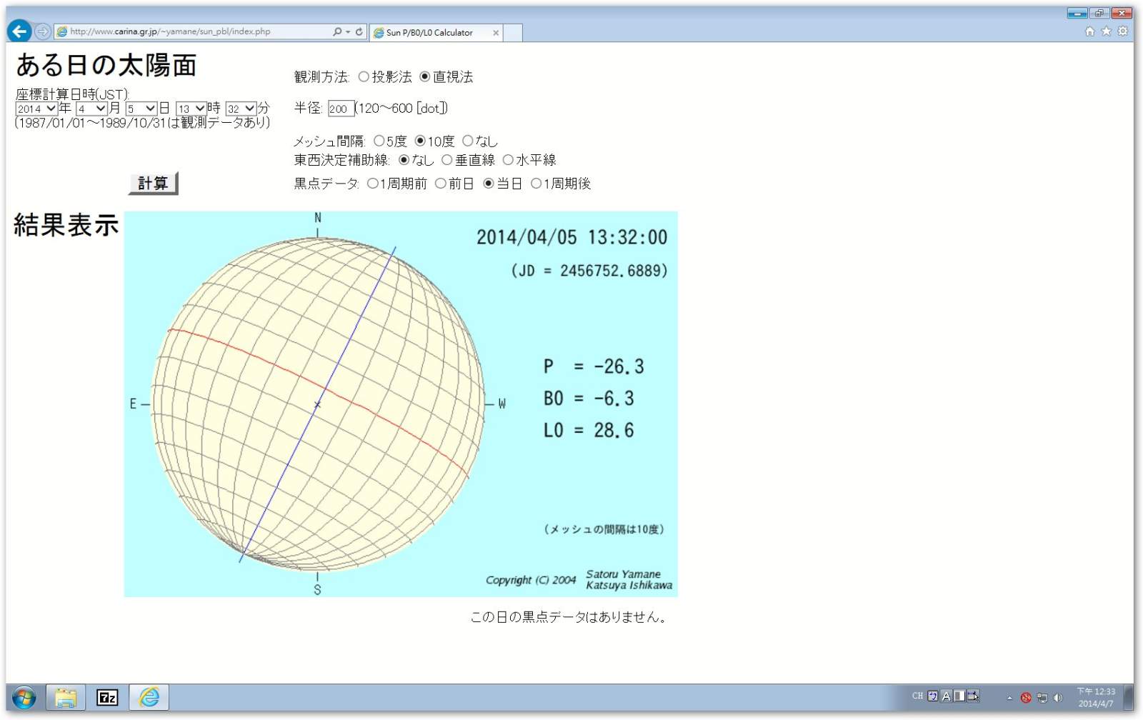 Solar spherical and sunspots observation test pattern from April 4 to 6, 2014