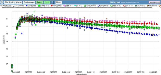 Figure 3: AAVSO(アメリカ変光星観測者協会) 2023 0714 latest data from Daxi Observatory and various observatories around the world SN 2023ixf supernova brightness curve changes