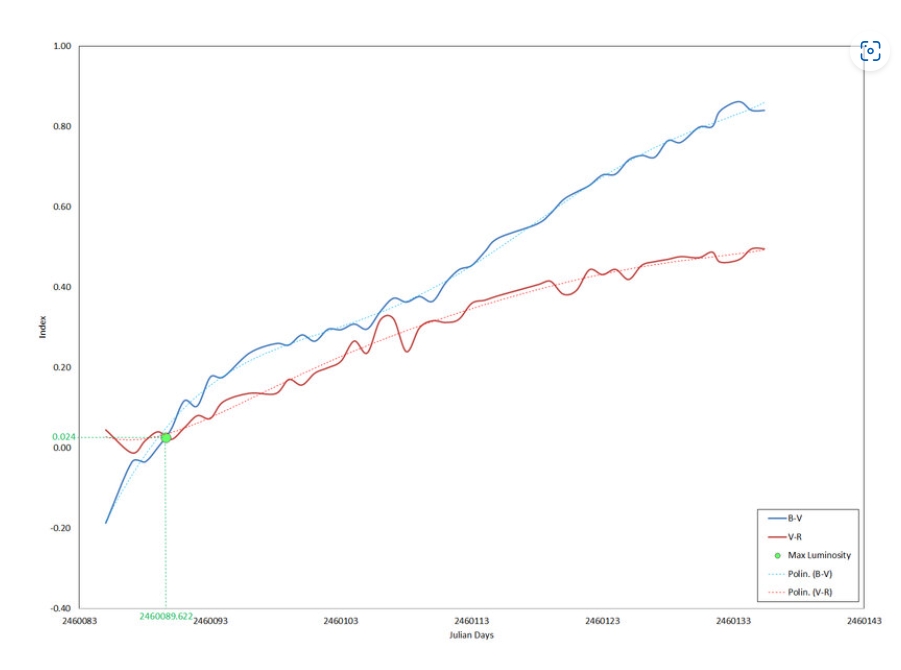 Interestingly,the measurements show a point corresponding to May 25, 2023 (JD = 2460089.622) where B-V = V-R