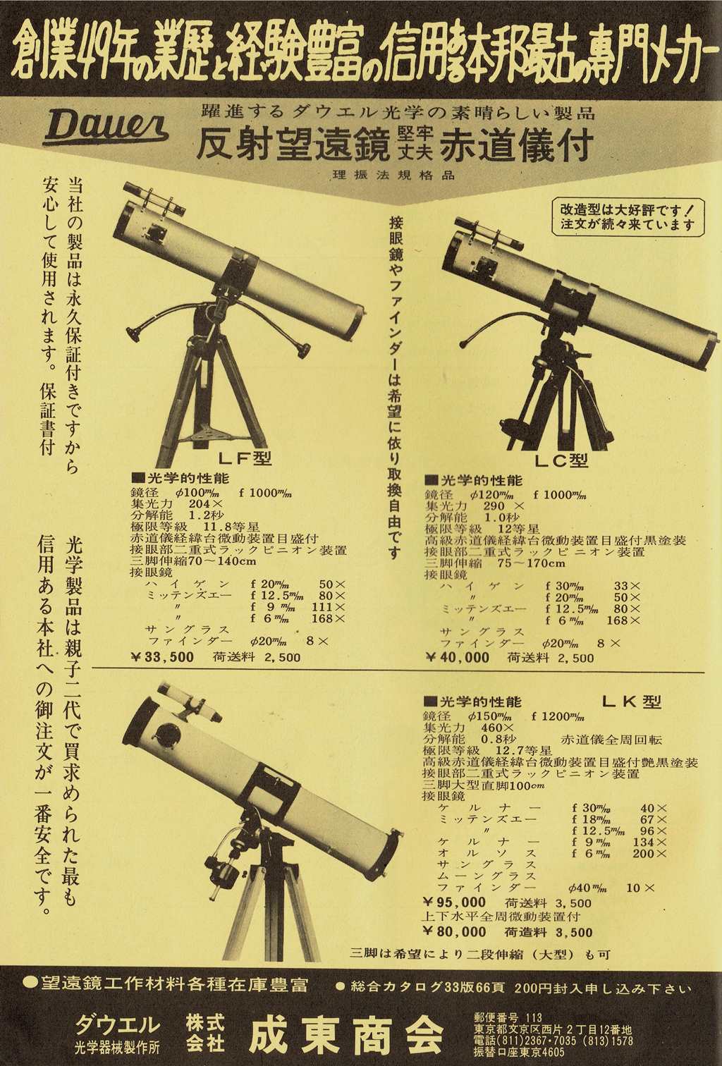 そんな状況で選んだのは、ダウエル12cm反射望遠鏡LC型。当時実績があり評判も良かった日野金属産業ミザールH-100型や新鋭の高橋製作所TS式1型は、口径が10㎝で5万円以上。ダウエルLC型は45,000円。他にダウエルにはほぼ同じ口径(114㎜)で1万円程安いモデルもあり、それに比較し架台も頑丈に見える。絶対良く見えて、架台も堅牢、通信販売しかしてないので安いんだ。地方の私には絶対狙い、疑わなかった。お金が貯まるのを待って中二の冬、注文し、舞い上がっていた。