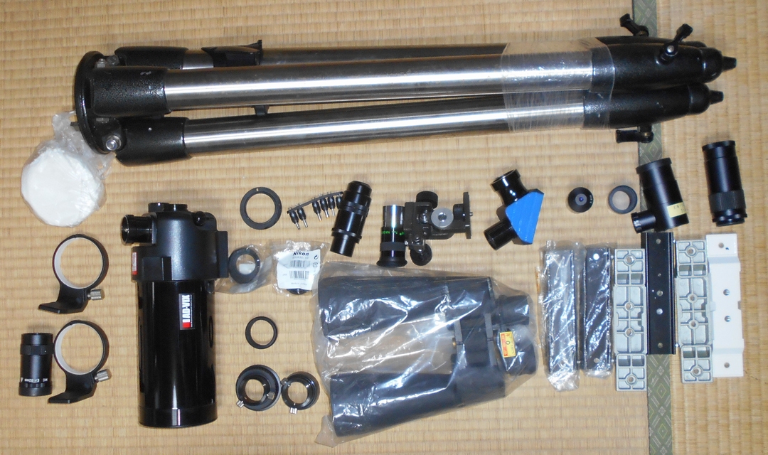 中央中段の黒い筒はK40+31.7mm変換アダプター。右横はナグラー7mmですが要分解清掃品。(内部のレンズに油滴状の微細なプツプツが無数にありコントラスト劣悪。揮発成分付着なら分解清掃で生き返るが、貼り合わせ面の発泡ならアウト。。。)その右はビクセン微動雲台。その右は笠トレさんの天頂ミラー。それぞれ1k。