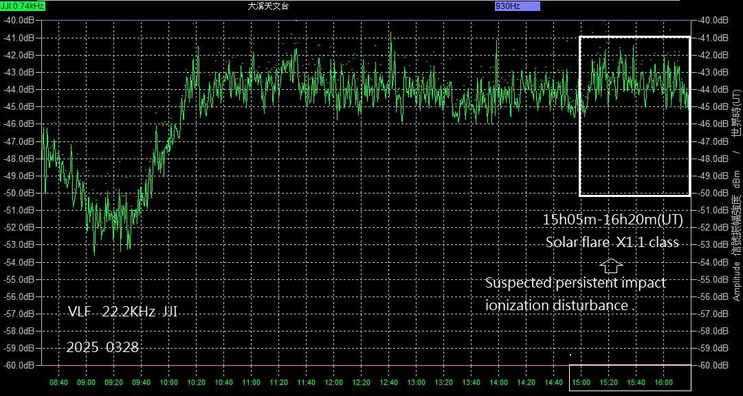 VLF 22.2KHz は、今回の太陽 X1.1 爆発の電離擾乱 (約 -1.5dBm の振幅変化) を観測していると考えられます。