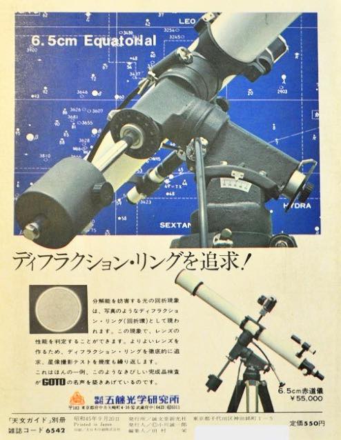 1976年発売の五藤光研の新製品、6.5cm赤道儀の広告です。私も持っていますが、かさばりすぎます(8cm望遠鏡なら楽々収まります)。仰角25度の調整ができません(広告では25度と書いてありますが、25度まで下げることはできません!28度までしか下げられず、そうでない場合は分解が必要です)。三脚自体もかさばるし重い!6.5cm赤道儀がなぜあんなにかさばるのか理解できません!