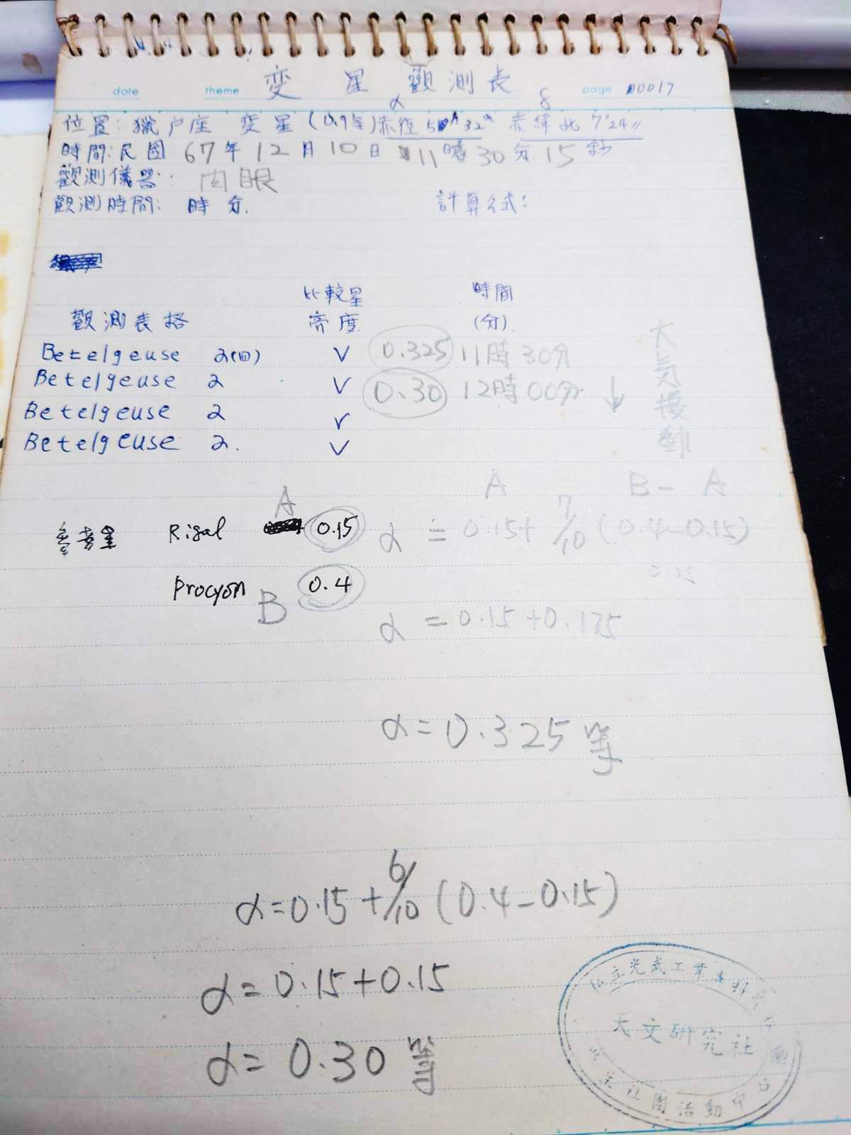 *.写真: 1978 年12月10日(台灣 民國67年12月10日)の変光星観察Noteの主な学習目標は、ベテルギウスの明るさを測定することです。これは、視測光の練習をするように頼まれた台長にとって、最高の入門目標です。私は半年ベテルギウスを観察します. . 私の主観的な測定誤差を修正しただけで、3.4 年前のベテルギウス減光事故の後、すぐに AAVSO の共同観測に参加しました。