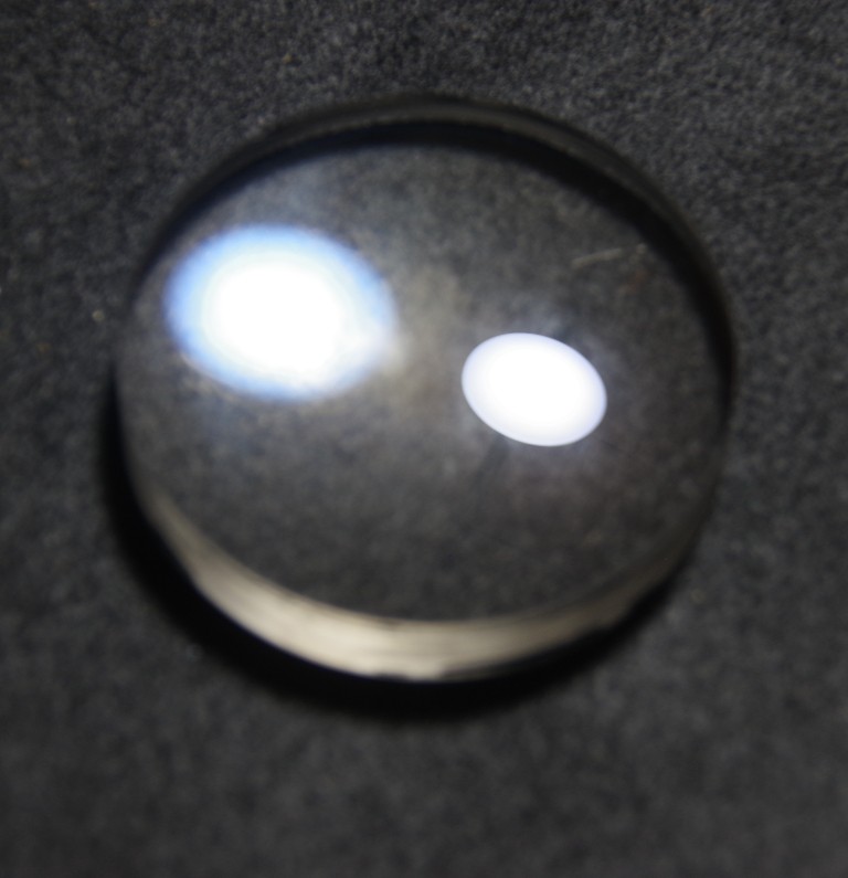 レンズを外して裏面側から反射を見ると、染料と空気界面の表面反射なのでニュートラルで白っぽい反射が見えるという「非対称性」を実現。恐るべし!日本の御三家も真っ青の光学系でした。こんな知恵があるならもっと良い方向に使って欲しいのだが。。。