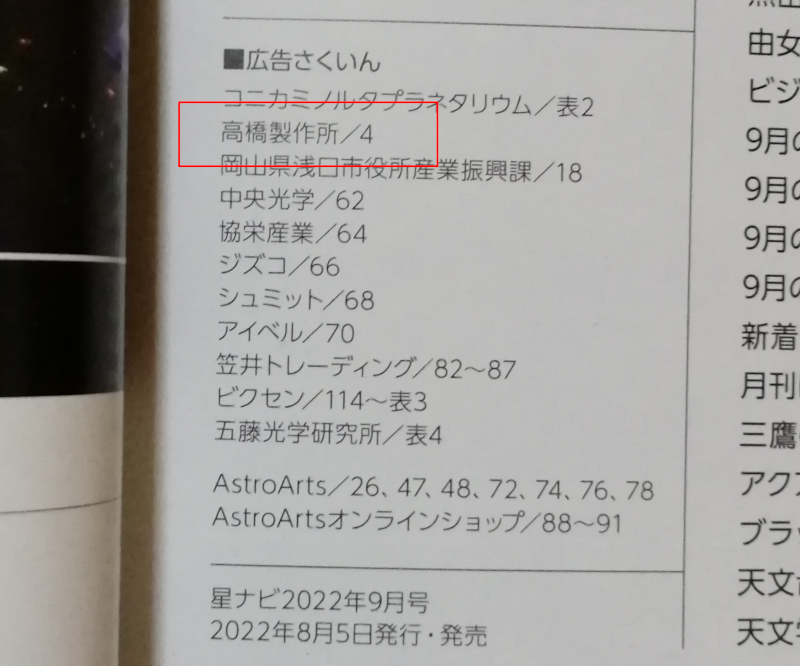 星ナビは2022年10月号以後、タカハシの広告は無くなっています。