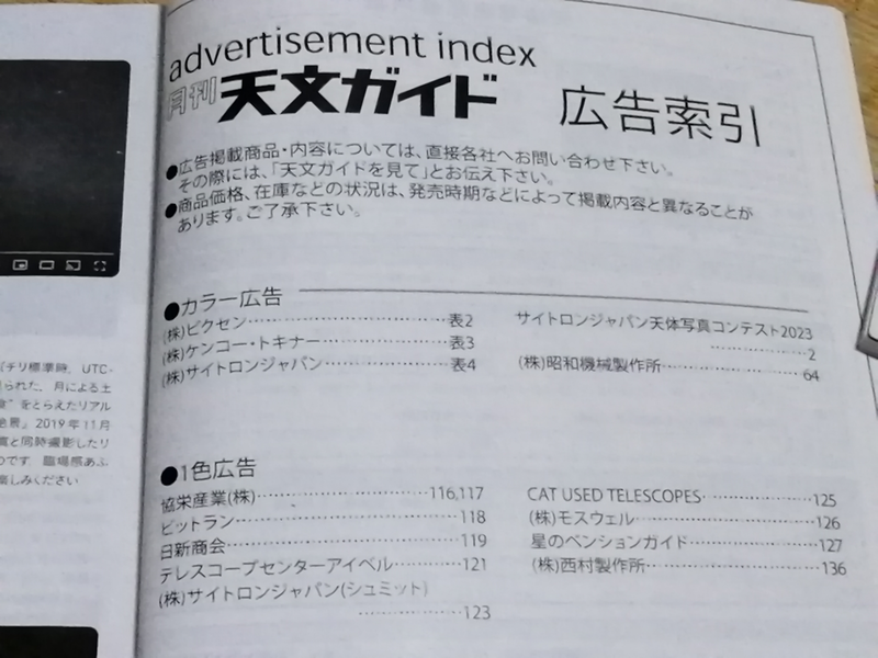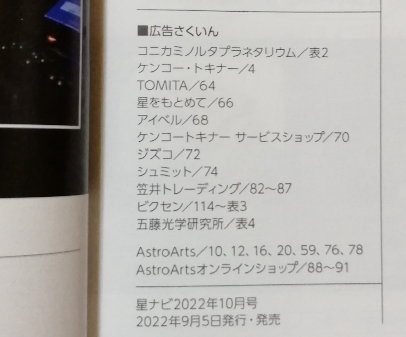 天文ガイド 2023年9月号 広告索引