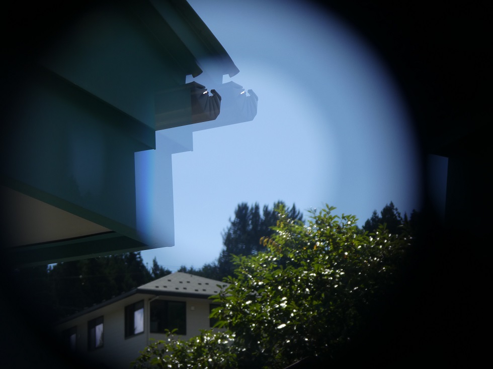 プリズムは無限大に合わせて接着しなさいと組み立て解説書にありました。アクリル板も完全な平面ではなく、力を加えると歪みます。接着剤が固まるまでに修正しなさいとあり、微妙な調整はセロハンテープで引っ張って固定。後ろのカバーをつけると強度が出て歪みは無くなりました。