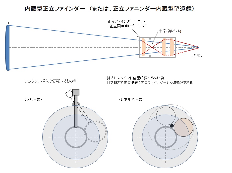 こんなの考えてみました。双眼鏡には難しそうですが、望遠鏡用として、本体と同焦点で目を離さなくていいというのがみそです。
