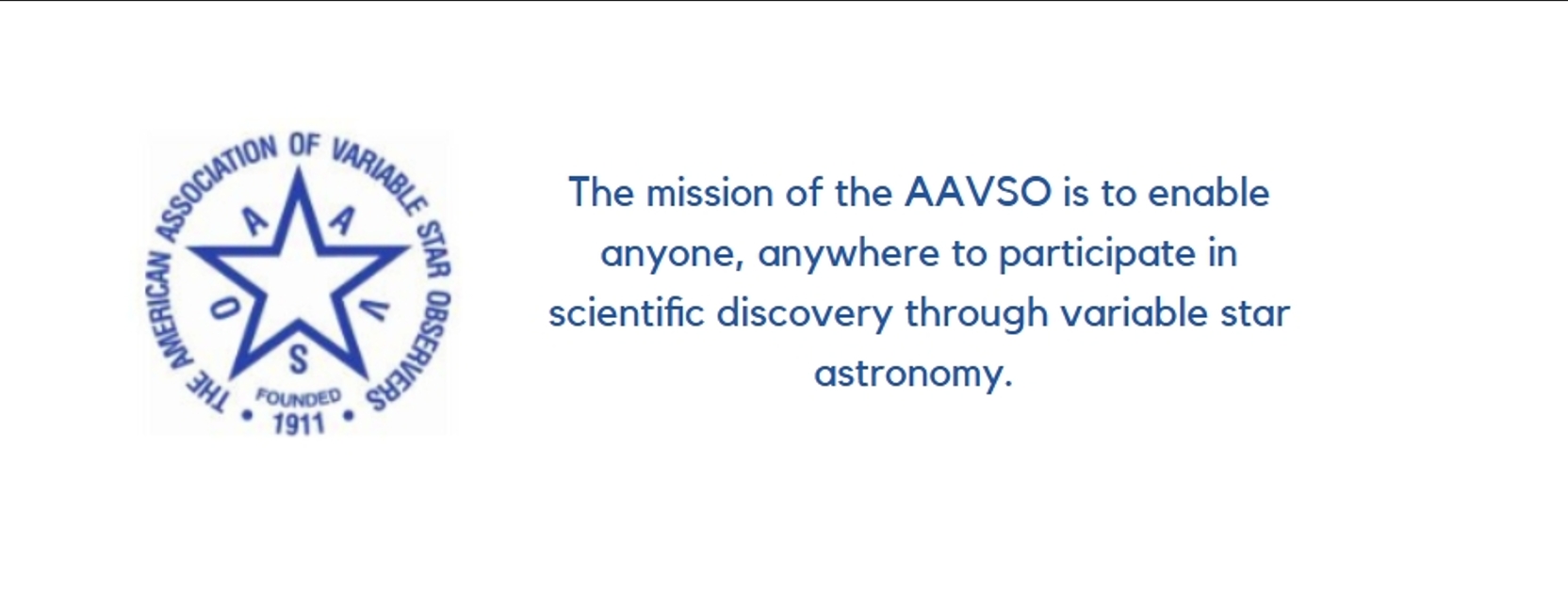 The mission of the AAVSO is to enable anyone, anywhere to participate in scientific discovery through variable star astronomy.
