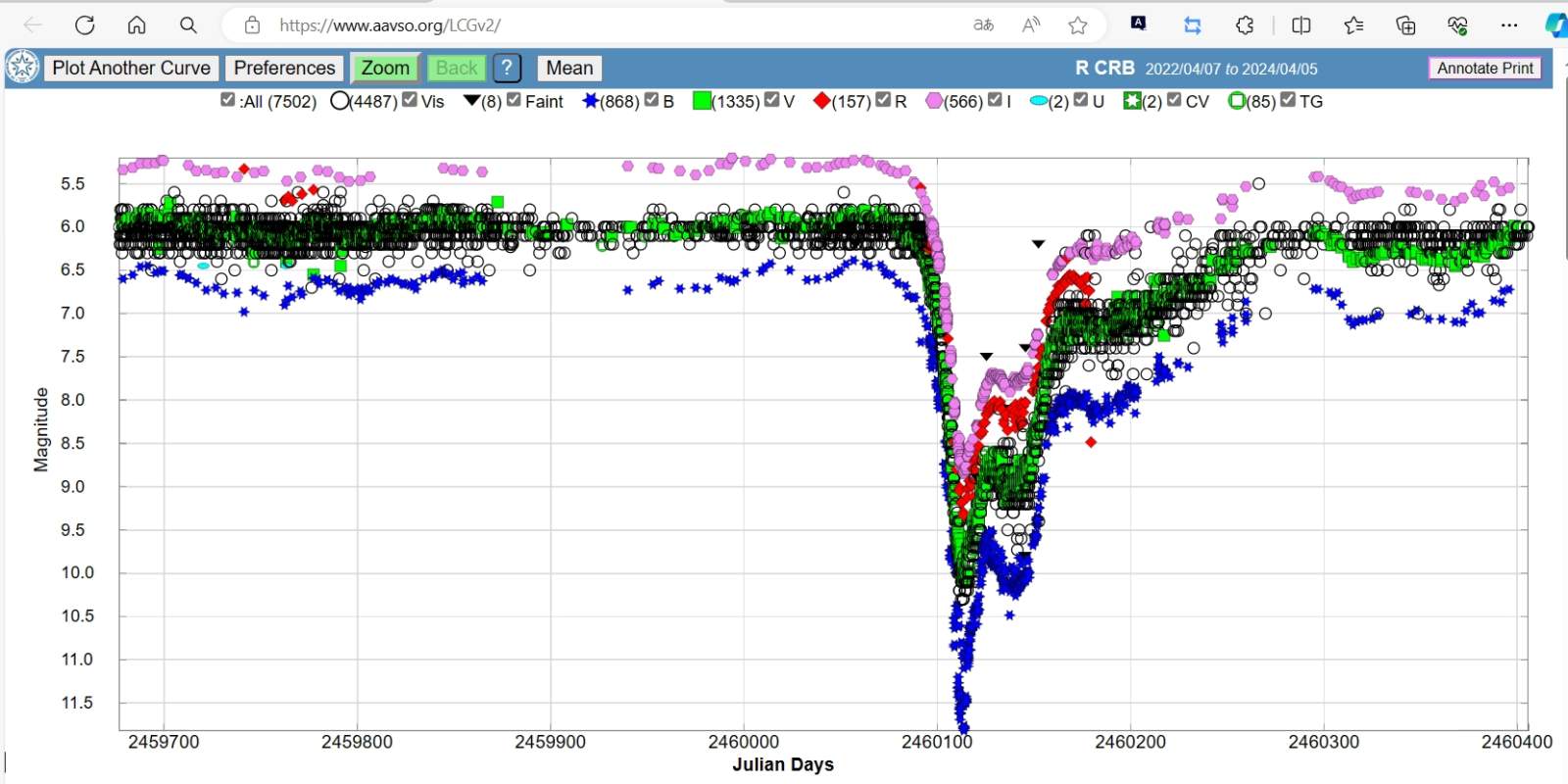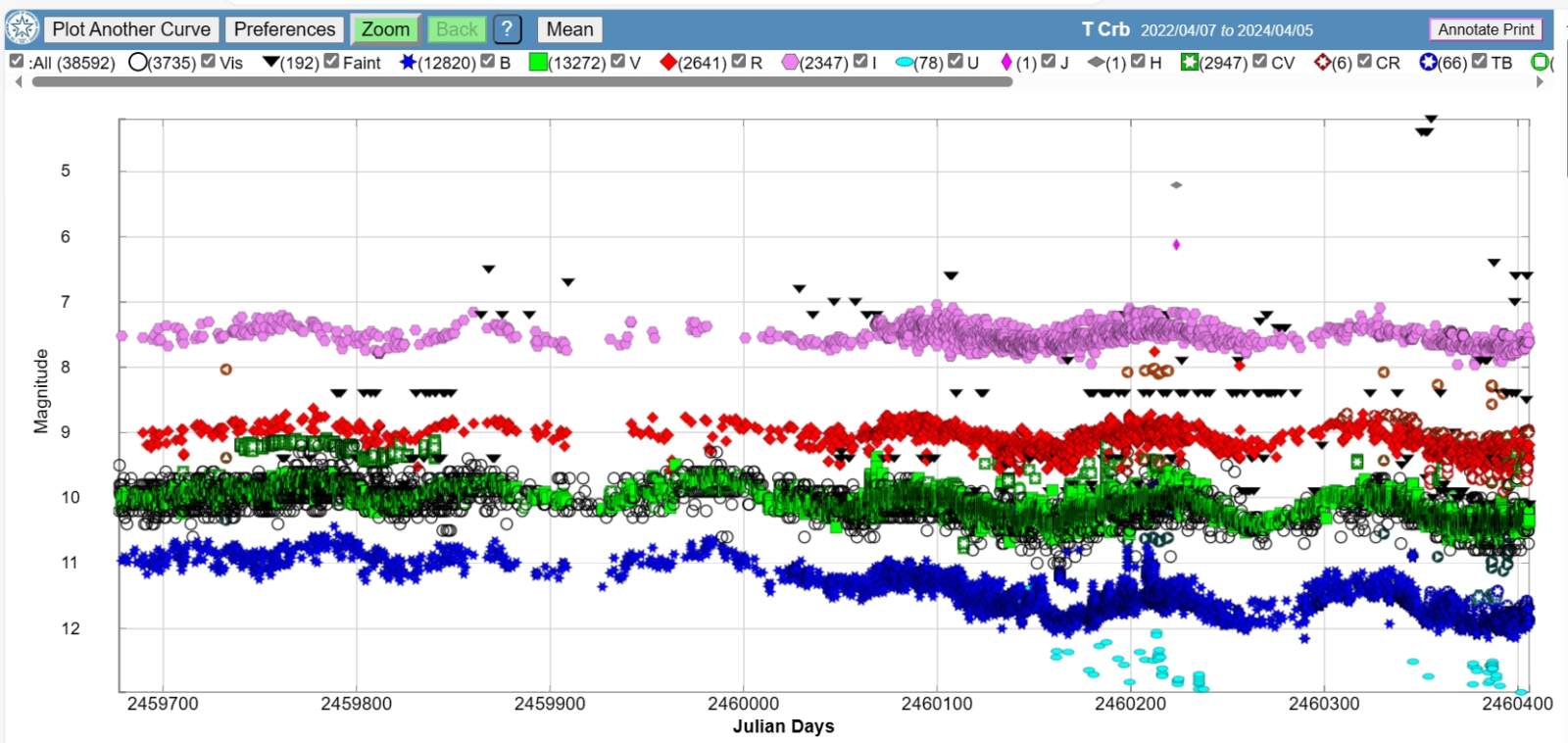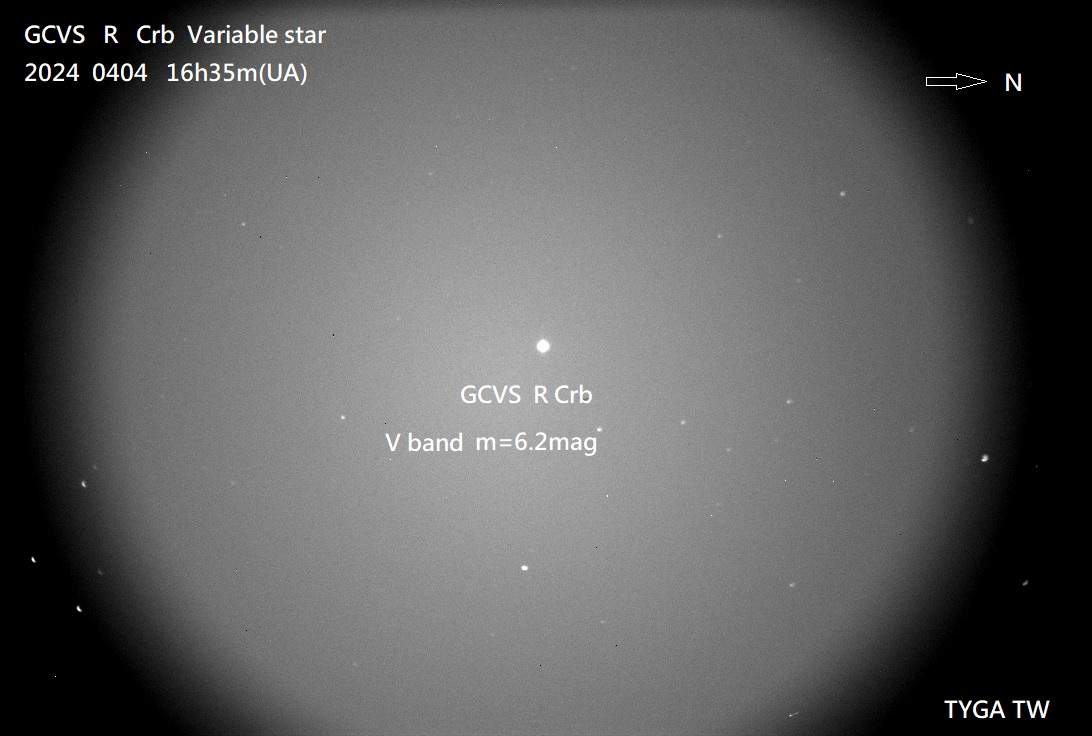 *. 北冠コロナにおける T 変光星 (T Crb) そのものの色光の観測では、V バンドと B バンドの色光の変化に着目します。これは、塵の個別の放出が最近発生した変光星(R CrB 星とよく似ています)で塵の吸収が増加していることと一致しています。 そこで、今回の観測にR Crb変光星の観測を追加しました(残念ながらB、R色光測光観測では雲の干渉により安定した星光画像が得られず、観測データは断念しました)。