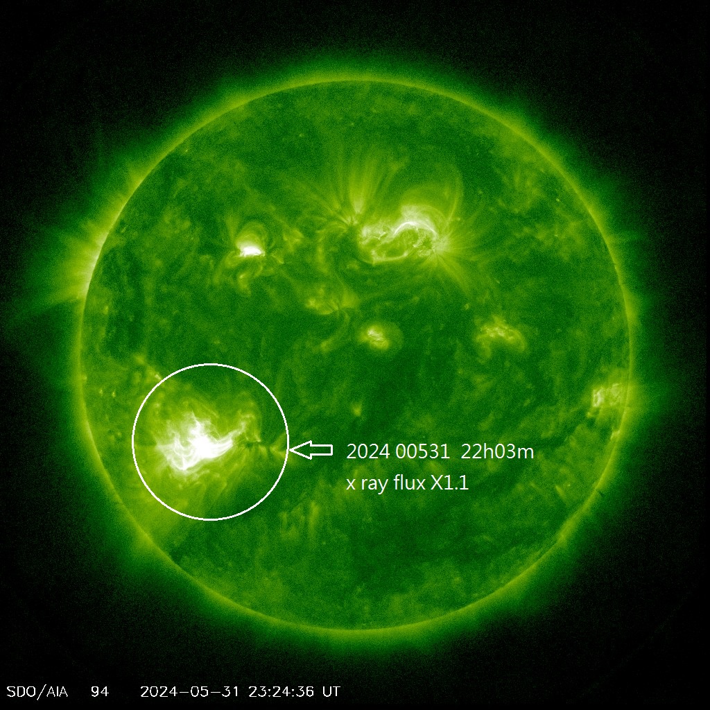 6月1日早朝4時、VLFは電離層のD層に入り太陽光を吸収し始め、信号は正常に徐々に減衰していきました。しかし、早朝、桃園大溪800/2000Hz FFT(メインデュアル観測スペクトルは狭められ補正されている)スペクトル観測システムが06時22分(世界標準時05時31分22時02分)にx1.1レベルのフラッシュを同時に検出しました。