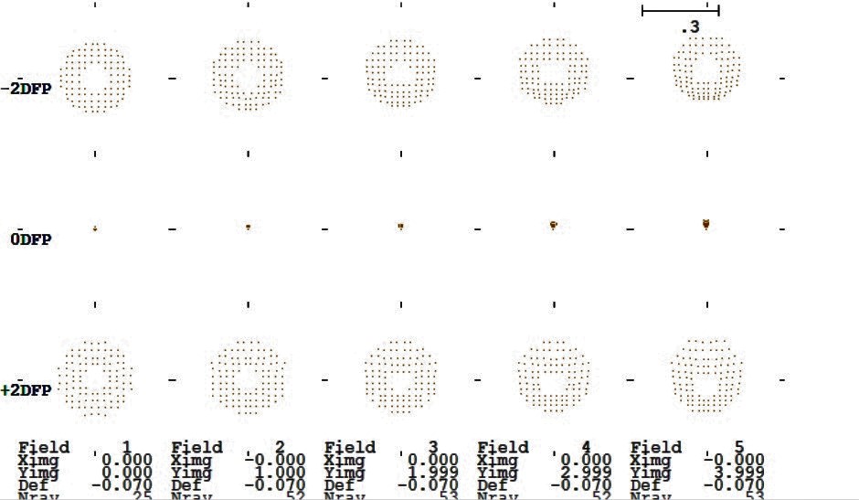 瞳面(主鏡面)にて直径を10等分割した碁盤の目ポイントの入射光によるスポットダイヤグラムを軸上から像高4.0mmまでの5像高 × 内側デフォーカス(内像)位置、焦点位置、外側デフォーカス(外像)位置の3箇所、描いています。