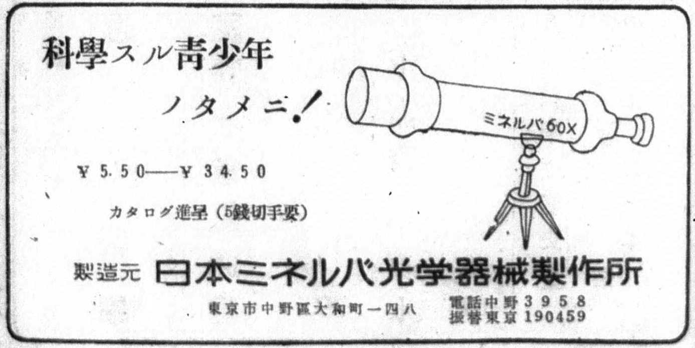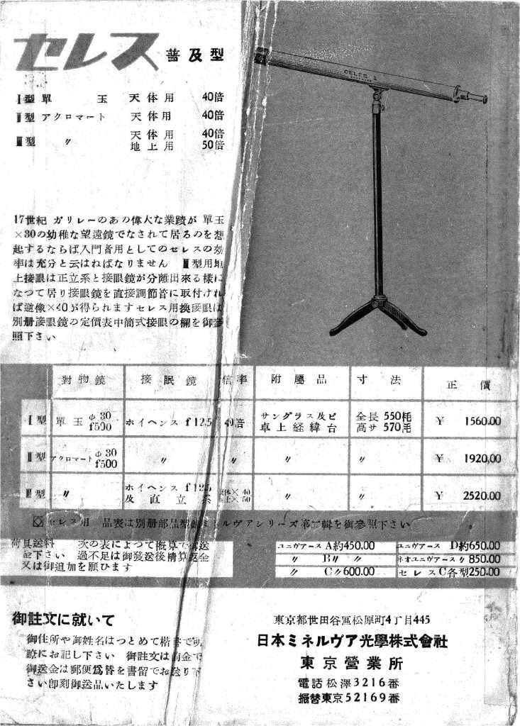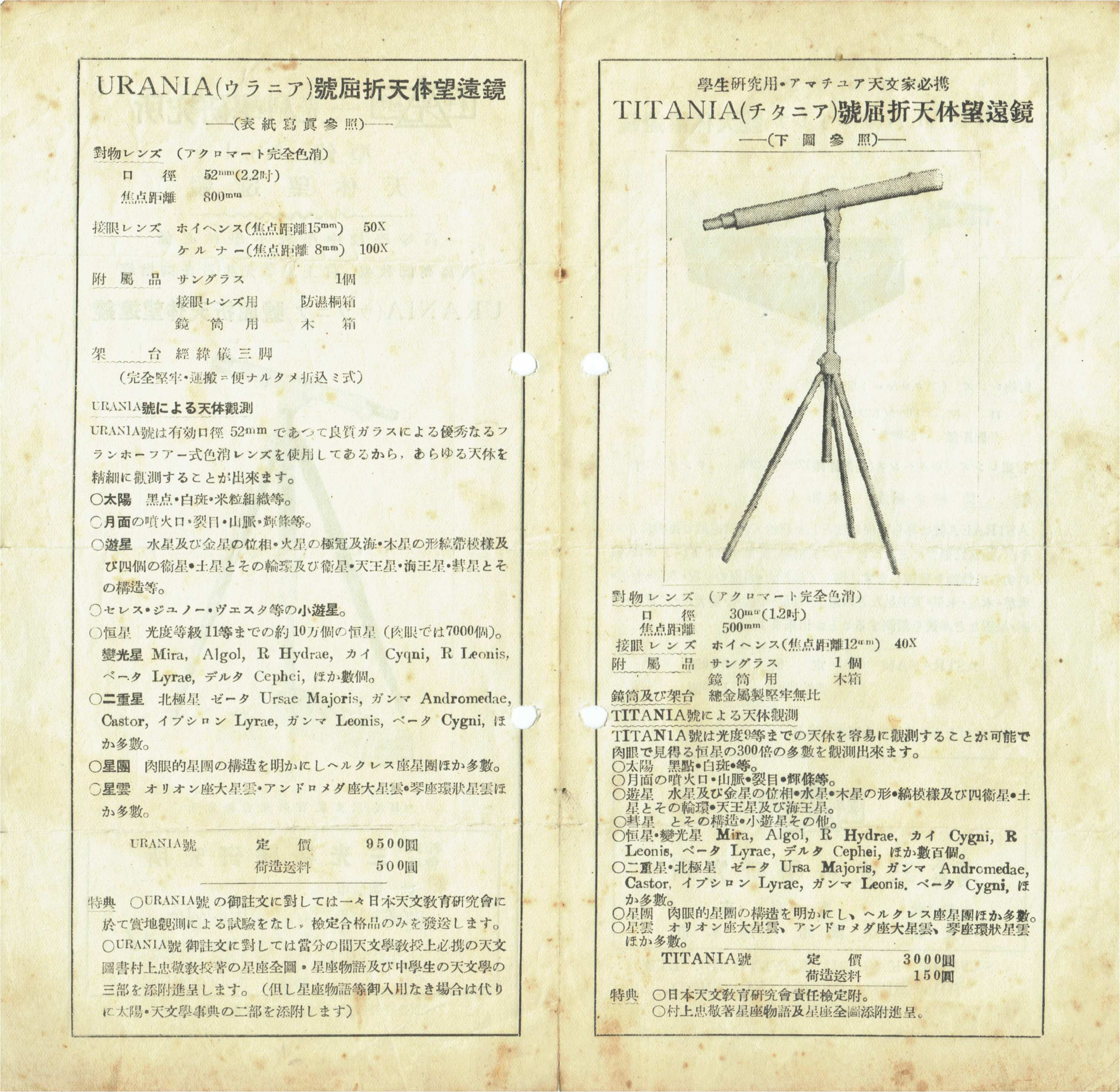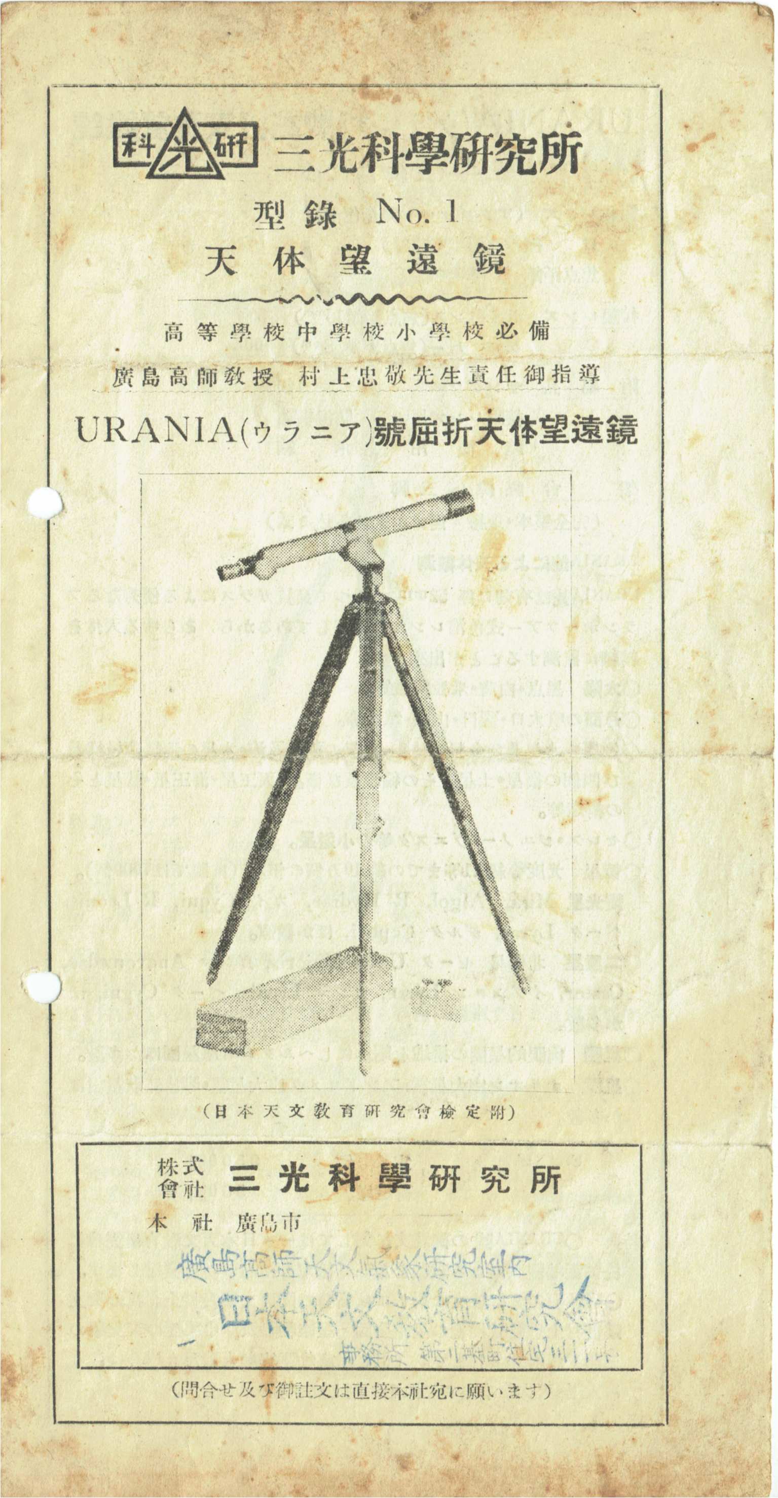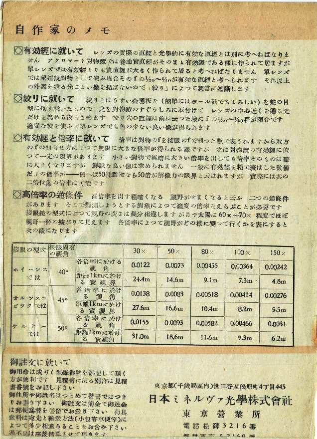 また広告には、大阪営業所・大阪市生野区~とあったようですが、この地域には眼鏡レンズや拡大鏡(虫眼鏡)の町工場や卸商が数多く集積していました。光学品の中でも拡大鏡は「キズ見」という呼称で、花形産業だった繊維紡績の検査に多量の需要があったようです。広告の大阪阪営業所ですが、零細な業界なので、東京や遠隔地の業者は営業所とは名ばかりで、間借りやアパートの一室を借りて、出張時の宿泊や、自転車を置き営業や集金に回る業者が、この近辺には戦後も昭和の終りまで多々見受けられました。稀にしか売れないニッチな望遠鏡や光学品だけで営業所まで置かないだろうと想像します。大阪営業所の電話番号がなかったのも、そのせいかもしれません。なお、戦前のレンズ品質は東高西低ということでした。