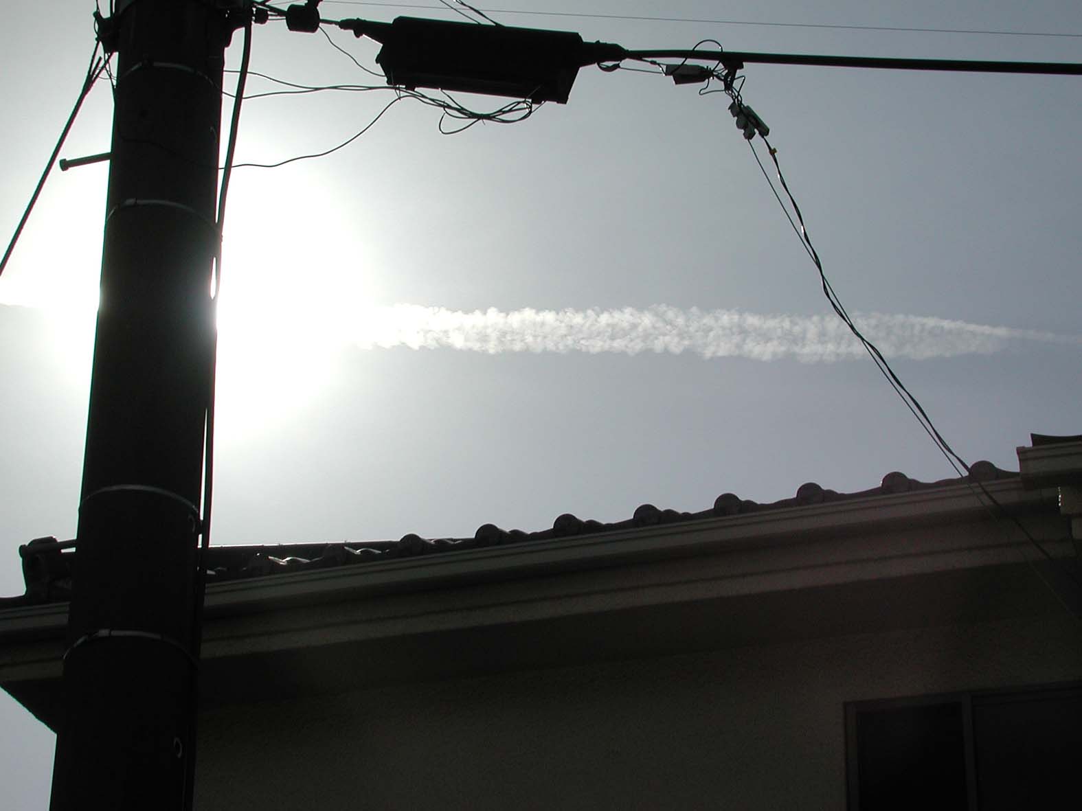 この飛行機雲は偏西風に乗っていつまでも太陽に掛かり続け、薄雲中で撮影の