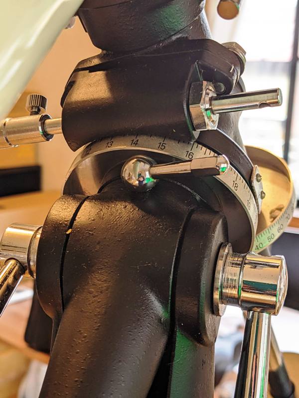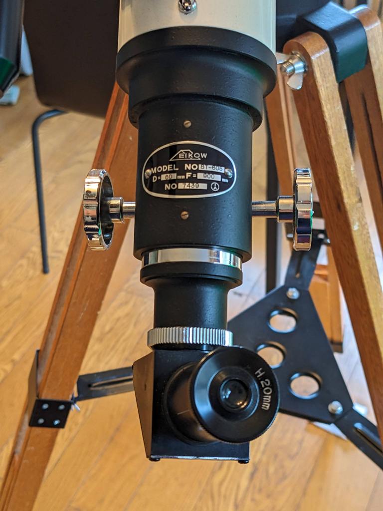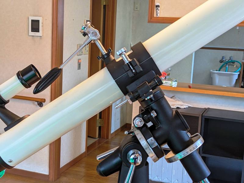 銘板によると1974年製のようで、エイコーグレー架台の時代よりいくぶん簡略化されていますが、それでも半球型の赤経クランプ、チャック式接眼アダプター、鏡筒バンドの止めナットなど、かなり凝った作りだと感じました。
