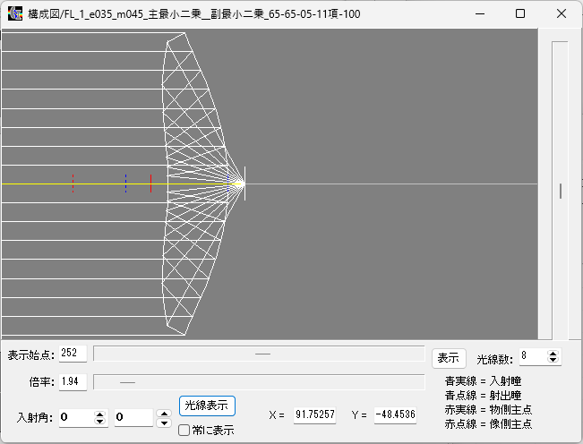 このケースでは、鏡面曲線の終端での変化が少なくなるように余裕をもってeを設定し、一応筒外に焦点が来るようにmも設定して上記の結果を得ました。