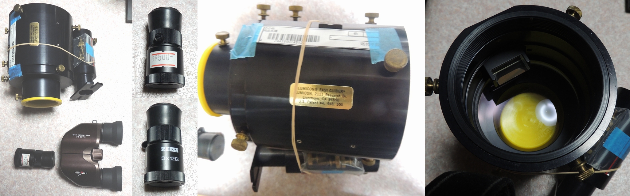 黒い太い筒はルミコンのジャイアントイージーガイダー。これも何故か中古カメラ屋にジャンク扱いで・・・3kでした。なんでこれがここに???レデューサーレンズも入ってました。貼り合わせレンズです。でも、これってC14~11までが対応機種だったはず。手元にはC8しかない。。。(笑)