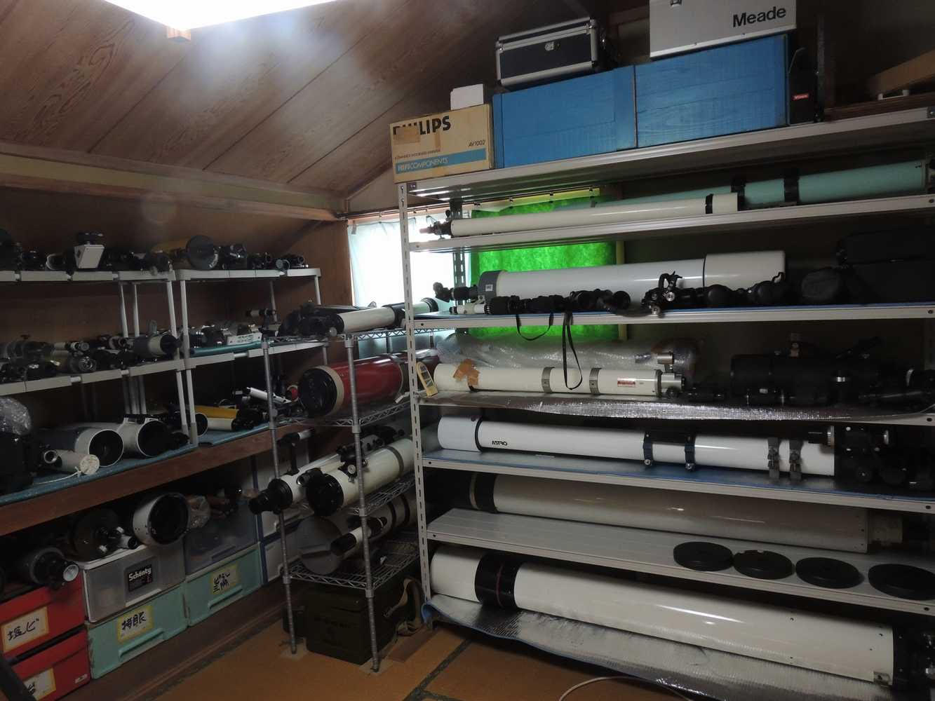 私の部屋はこんな感じ。押し入れを3段に分けて小鏡筒を。大きい長鏡筒はスチールラックに。他にラックが右側にあって、ラック同士を鉄ステーでつないで転倒や横ずれしないように地震対策しています。スチールラックには長穴がたくさんあるので、自転車のゴムロープを10本以上かけて地震対策。左の押し入れは普段は襖を閉めています。部屋にはペルチェ式の除湿機と空気清浄機をおいて24時間稼働。人間がいなければ夏でも湿度40%台。普段は部屋の中央にミカゲ21ドブや他の赤道儀が林立しているのですが、この写真を撮ったときはスチールラック導入後の早い段階だったので写真が取れました。他にもベッドの下に魚雷のように入った鏡筒が・・・(汗)