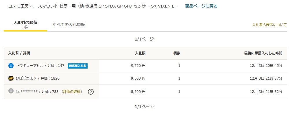 入札者の本当のIDが表示されなくなっています。まぁ個人情報なんたらで致し方ないかもしれませんがどなたが入札