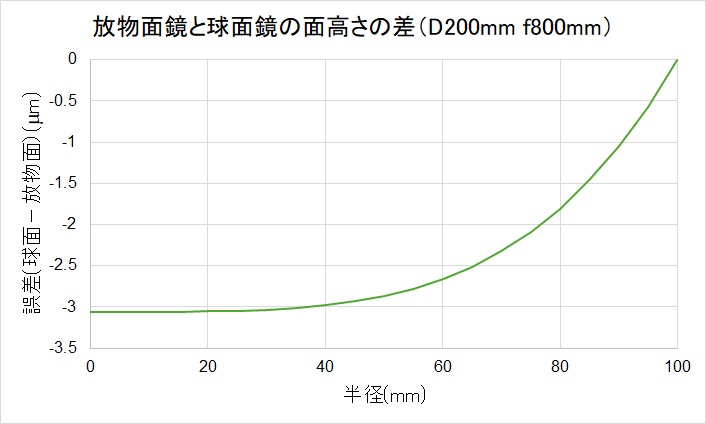 D100mmf200mmでは曲率206.3mmの球面になり、最外周基準では中心部が放物面よりも高い球面になりました。