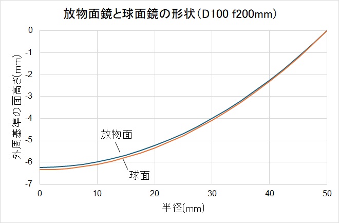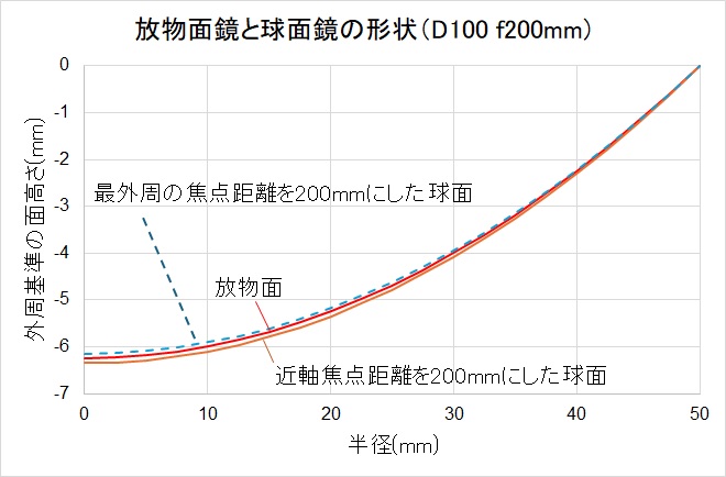 参考にD100mm f200mmの放物面と球面の外周を一致させた場合の形状グラフをアップロードします。