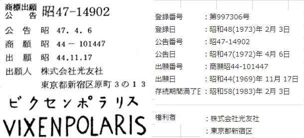 同年11月17日に(株)光友社は、登録商標 「VIXENPOLARIS (ビクセンポラリス)」 を出願しています。