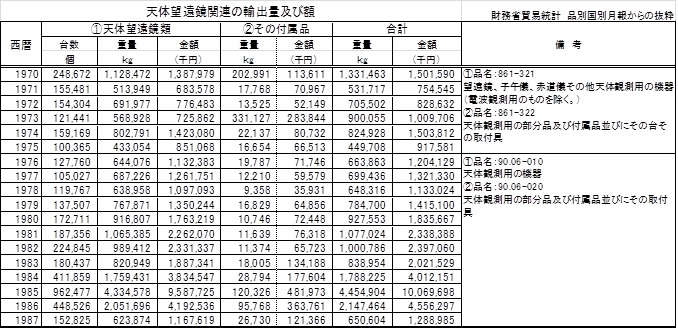1970-87年においては、輸出品別国別表に「天体観測用の機器」「天体観測用の部分品及び付属品並びにその取付具」という品目に区別されている。1969年以前、1988年以降については品目が変わり推移を引き継げるデータが見つかっていない。