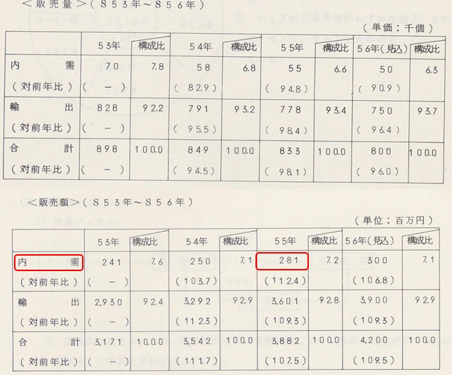 本資料によれば、1980年においても「望遠鏡は輸出主体の市場であり、販売量の90%が輸出されている」