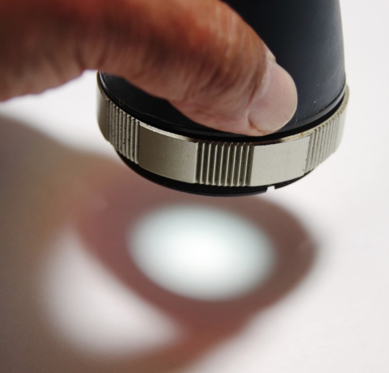 透過光を白い紙の上に映しました。確かに青っぽいです。ただ、紙の白が対物正面に反射して、周りが赤っぽいです。