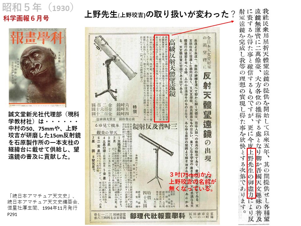 ”誠文堂新光社代理部(現科学教材社)は・・・・・・中村の50、75mmや、上野珓吉が研磨した15cm反射鏡を石原製作所の一本支柱の経緯台に載せて供給し、望遠鏡の普及に貢献した。”とあります。