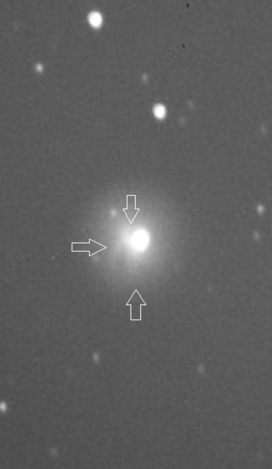 Cousins Rフィルターは、彗星の疑わしいイオンsuspected ion tail尾を湾曲した角度で観察することができ、2つのイオン尾が彗星の核から放出されるのが観察できます。図2: