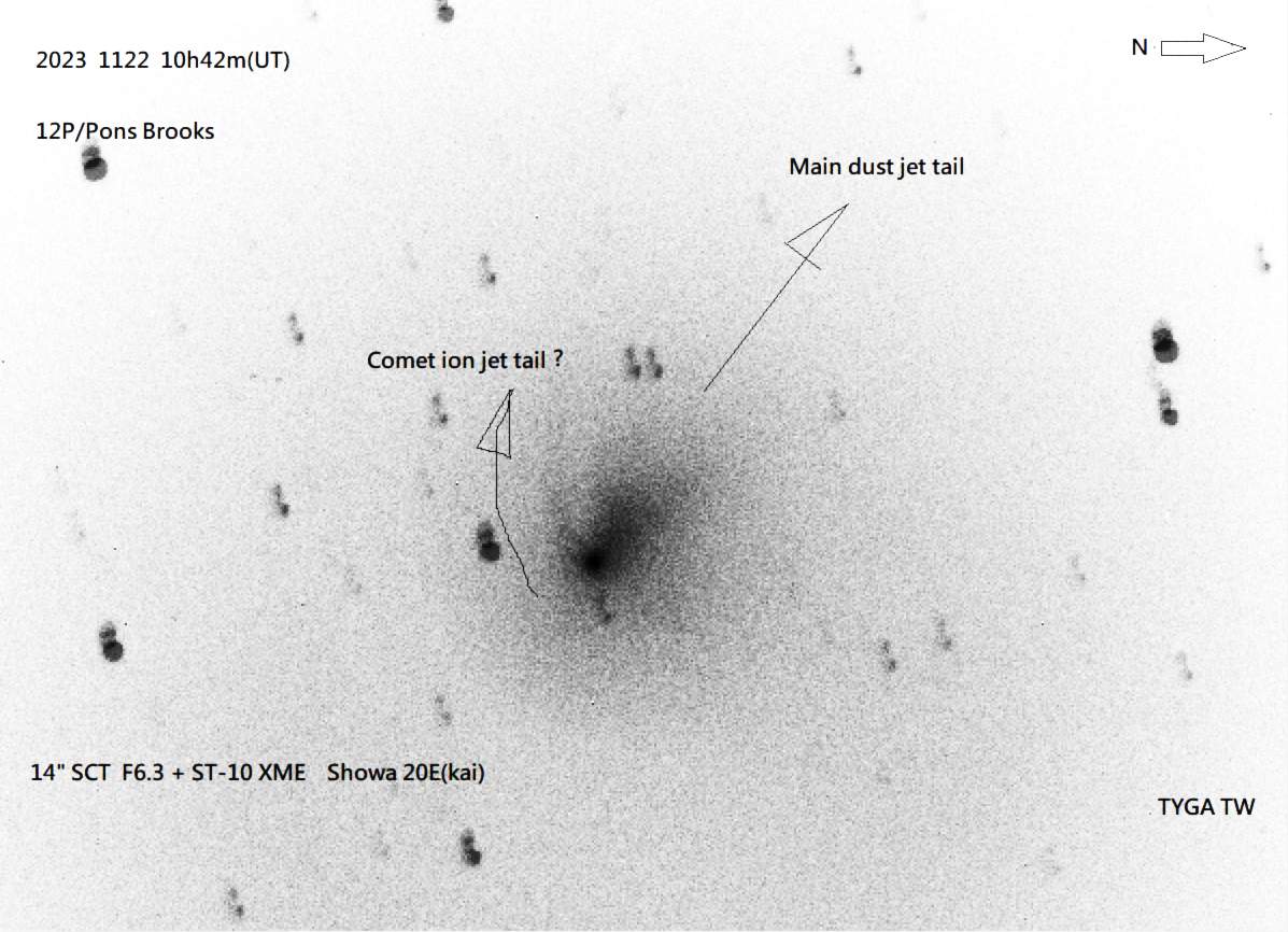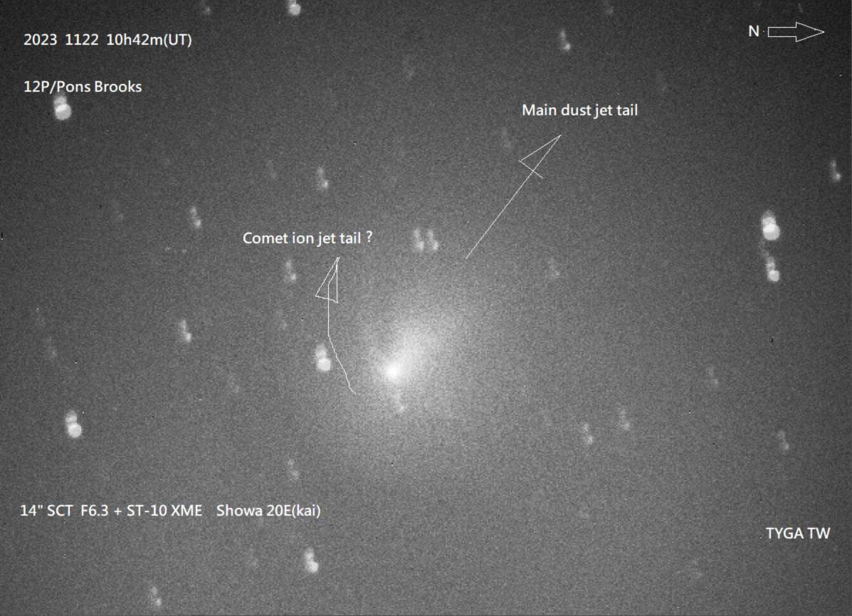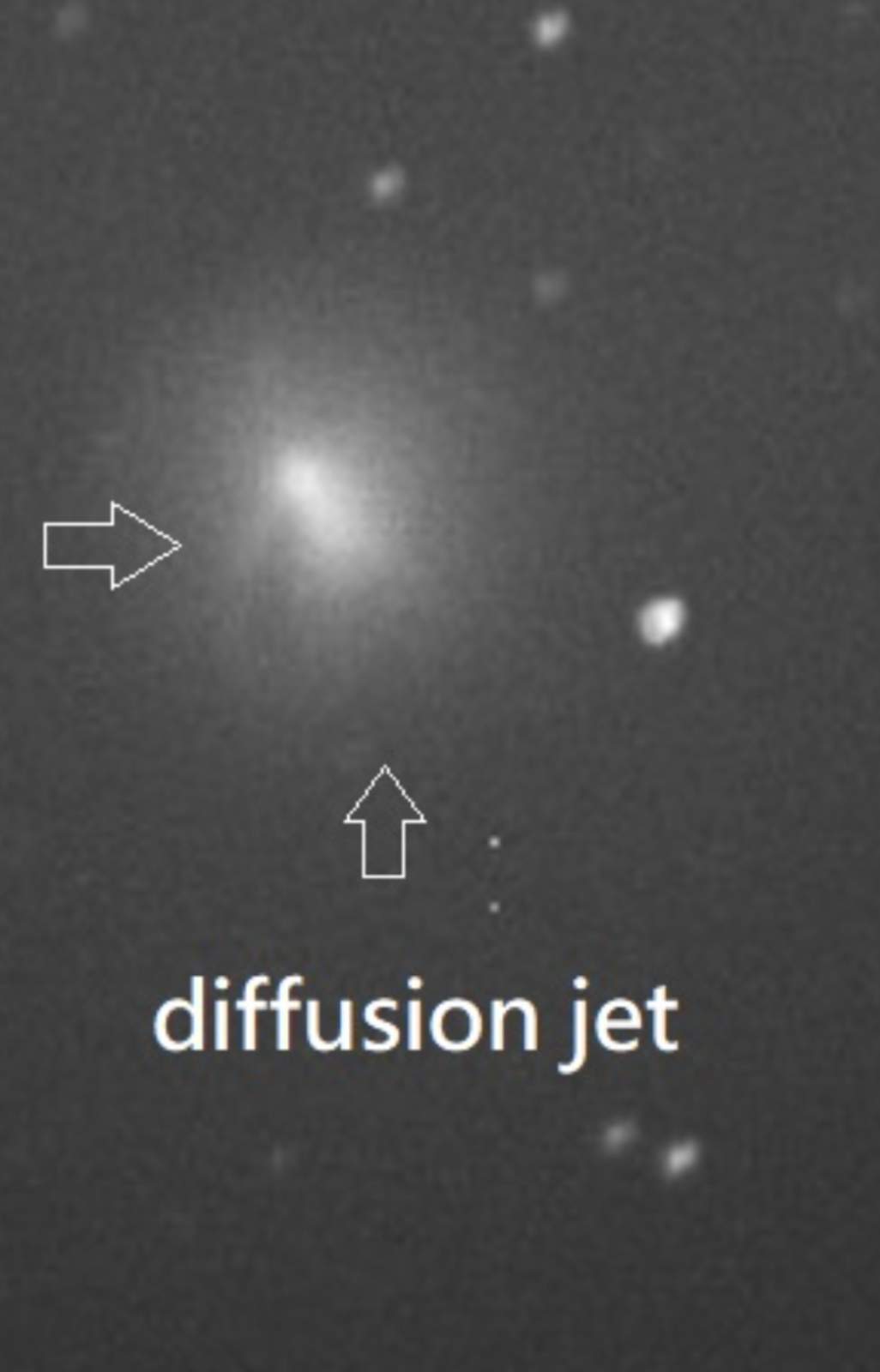 19日夜には12Pジェット(diffusion jet)の拡散が非常に大きいのが観測されたが、これを破片(fragment)と呼ぶ人もおり、小さな破片に分かれて噴火した。 個人的には、もう一度観察して18日の明るさを比較する必要があると思っていますが、19日にジェットが膨張した後、彗星核の明るさは確かに暗くなりましたが、もしかしたら12P彗星の彗星核の質量が変化したように見えるのかもしれません。