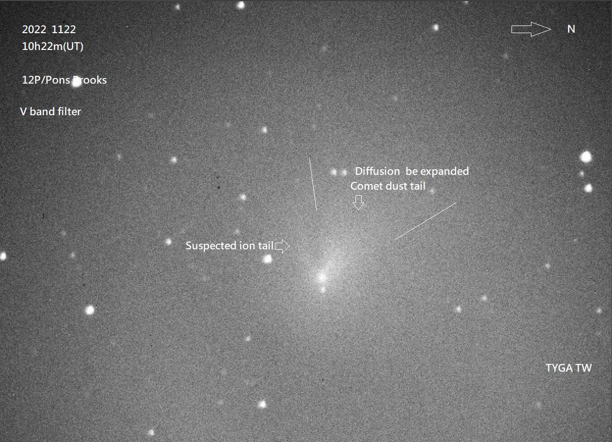 22日の観測12P、大溪天文台は2つの色光フィルター「Johnnson V」と「Cousins R」を使用して、彗星のdust tailとsuspected ion tail をそれぞれ観測した。