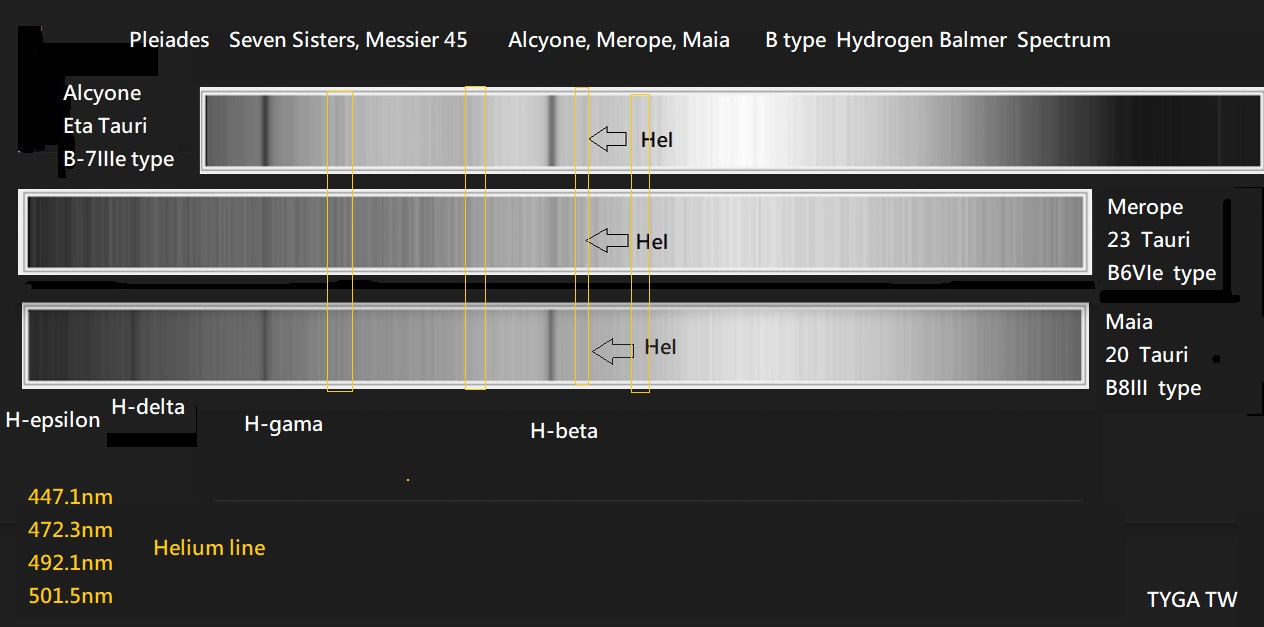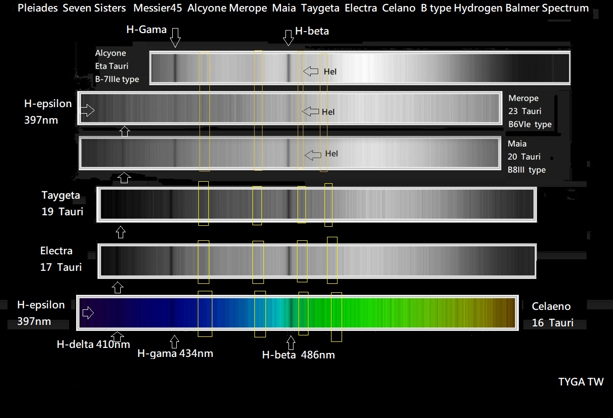 おうし座のプレアデス星団(M45)の 3 つの主要な星、短波長の水素バルマーのスペクトル(Hydrogen Balmer)