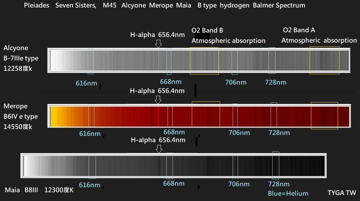 おうし座のプレアデス星団(M45)の 3 つの主要な星、長波長の水素バルマーのスペクトル(Hydrogen Balmer)