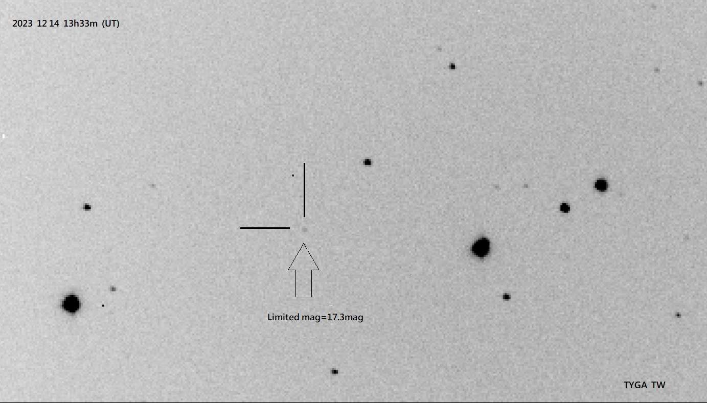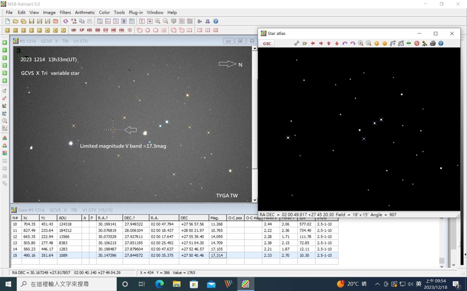 *.GCVS T Tri 変光星 2023 1214 09h26m (LT) の夜間の背景限界等級は 17.3mag v band です。