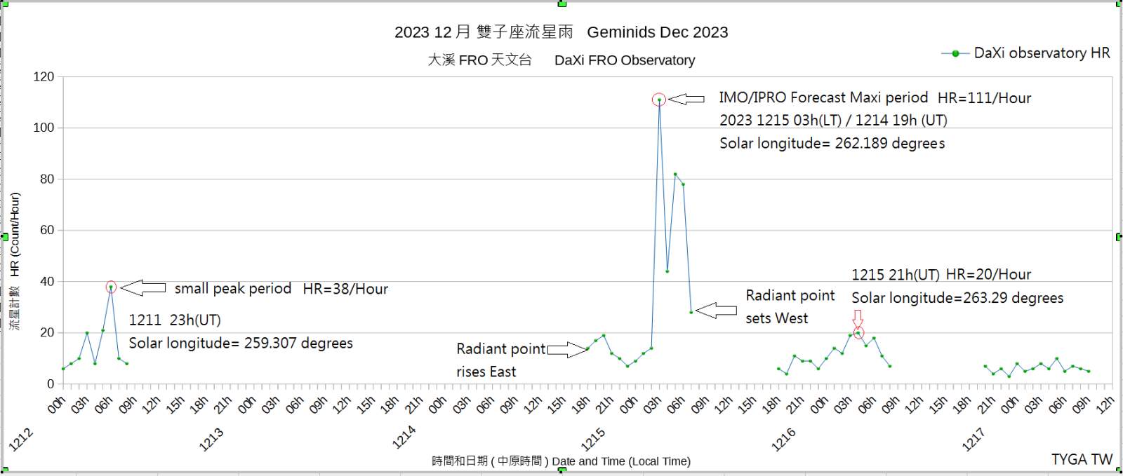 *. 大溪天文台で観測されたふたご座流星群の最大周期は12月15日午前の3時間、太陽経度=262.189度、IMOが予測した最大周期の時間と一致している 図1