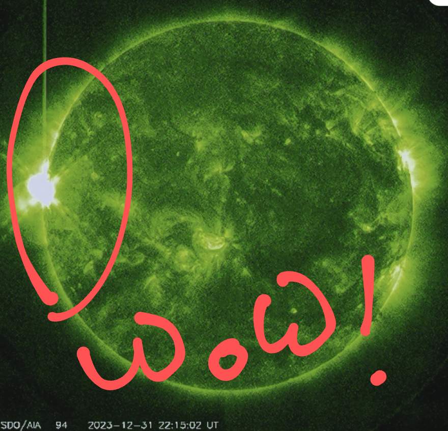 図 3: 太陽彩層での紫色の光の波長が見える 2024 0101 午前 6 時、太陽の左端で X6.0 レベルの閃光爆発が発生しました。 うわー!! 2023 1231 22h(UT)