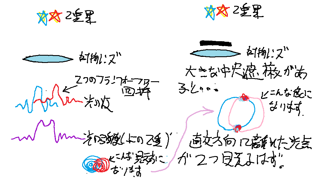 すると焦点面での2重星の回折像もリング状になりますので,接近した明るい2つの光点は,直交方向に離れた(ややぼんやりした)薄暗い2点に変換されます.