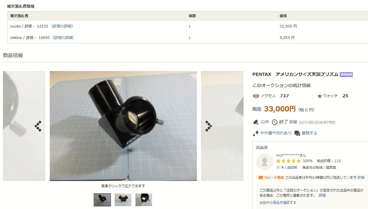 PENTAX 天頂プリズム 33,000円で落札されました。