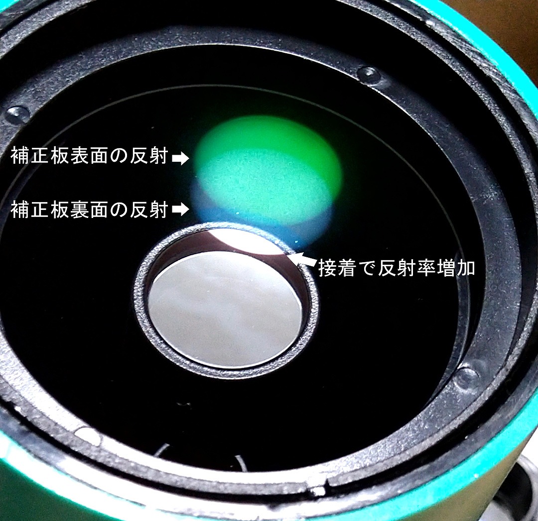 補正板側から見たところ、マクストフカセグレンでは補正板(メニスカスレンズ)の主鏡側の面にアルミコートを