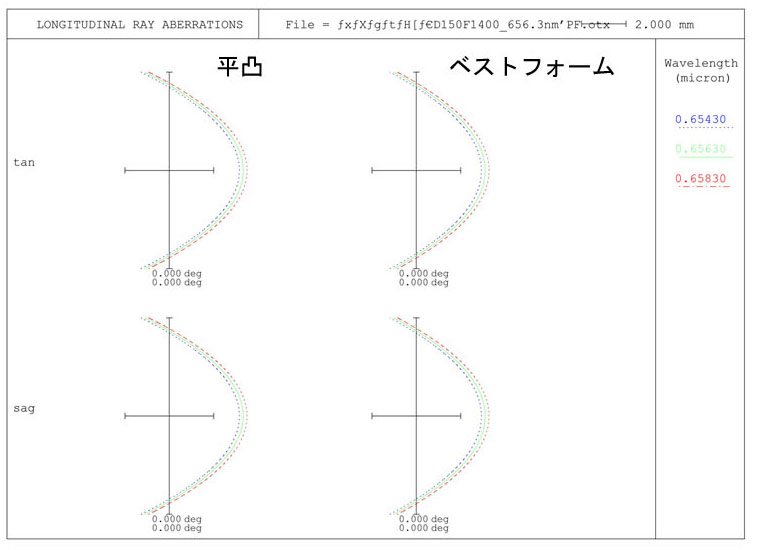 結果は平凸よりもベストフォームの方がすこし収差が小さいものの大差ありませんでした。