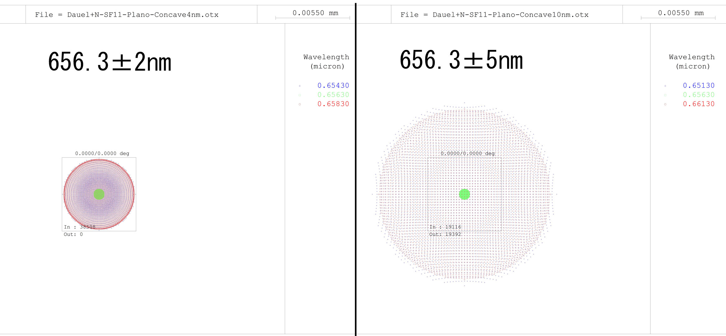 色収差は補正できていないので波長範囲を±5nmに広げると途端にスポットが大きくなります。(図3の右側)