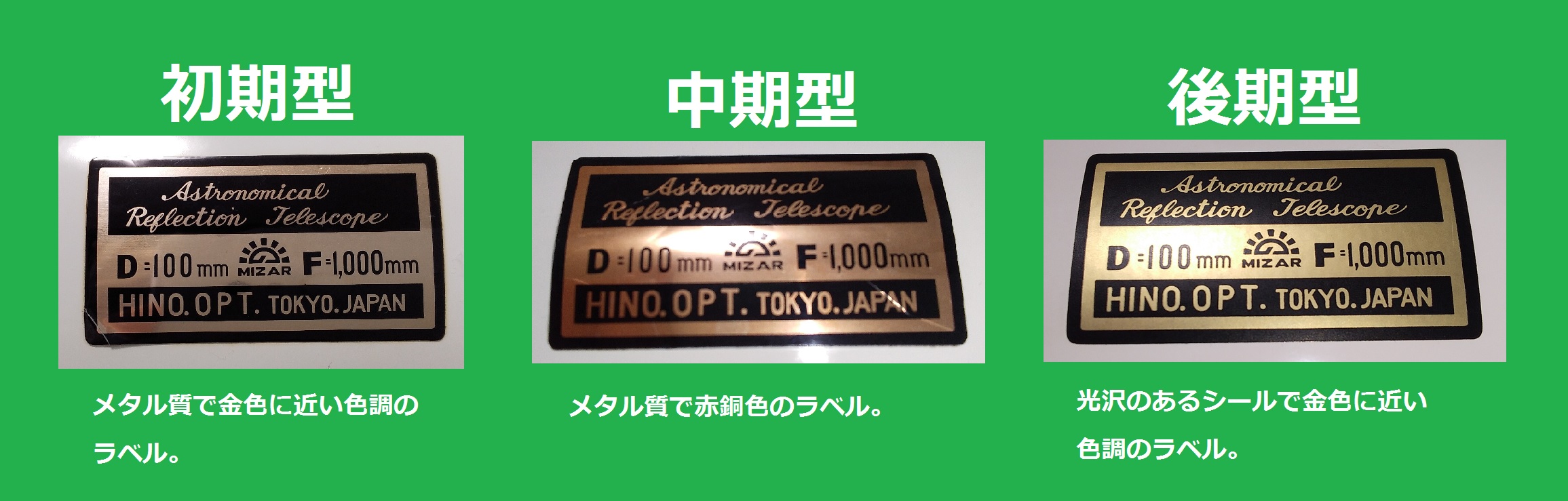 いままであまり気にしていなかったのですが、鏡筒に貼られている名板シールが3台とも異なっていたため、年式を特定する情報のひとつにならないかなと思い、投稿いたします。