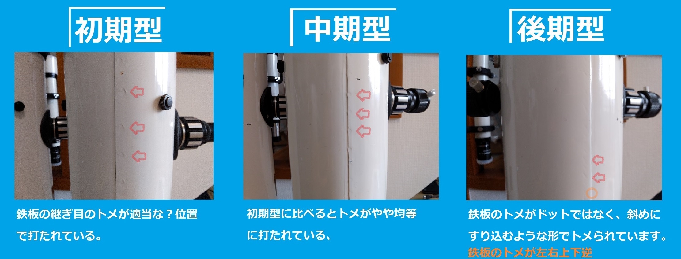 その鏡筒の鉄板の継ぎ目の部分がそれぞれトメめ方が違っていました。