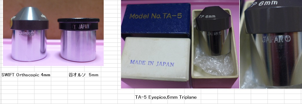 谷光学さんのアイピースはOEMも含めたくさんの形があり、SWIFTの付属アイピースはカタログの左から2列目の中ほど、角が取れたオルソアイピースの金枠に入っていたと思います。